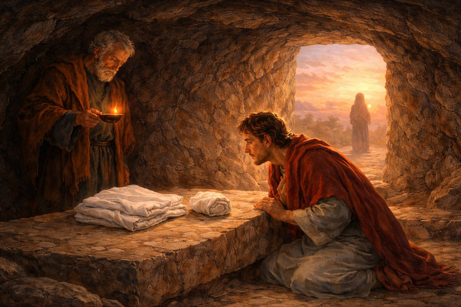 | Tin Mừng Chúa Giê-su Ki-tô theo Thánh Gioan Ngày đầu tuần, Maria Ma-đa-lê-na đi ra mồ từ sáng sớm khi trời còn tối và bà thấy tảng đá đã được lăn ra khỏi mồ, bà liền chạy về tìm Simon Phê-rô và người môn đệ kia được Chúa Giê-su yêu mến, bà nói với các ông rằng: “Người ta đã lấy xác Thầy khỏi mồ và chúng tôi không biết người ta đã để Thầy ở đâu”. Phêrô và môn đệ kia ra đi đến mồ. Cả hai cùng chạy, nhưng môn đệ kia chạy nhanh hơn Phê-rô và đến mồ trước. Ông cúi mình xuống thấy những khăn liệm để đó, nhưng ông không vào trong. Vậy Simon Phê-rô theo sau cũng tới nơi, ông vào trong mồ và thấy những dây băng nhỏ để đó, và khăn liệm che đầu Người trước đây, khăn này không để lẫn với dây băng, nhưng cuộn lại để riêng một chỗ. Bấy giờ môn đệ kia mới vào, dù ông đã tới mồ trước. Ông thấy và ông tin, vì chưng các ông còn chưa hiểu rằng, theo Kinh Thánh, thì Người phải sống lại từ cõi chết. (Ga 20, 1-9) |